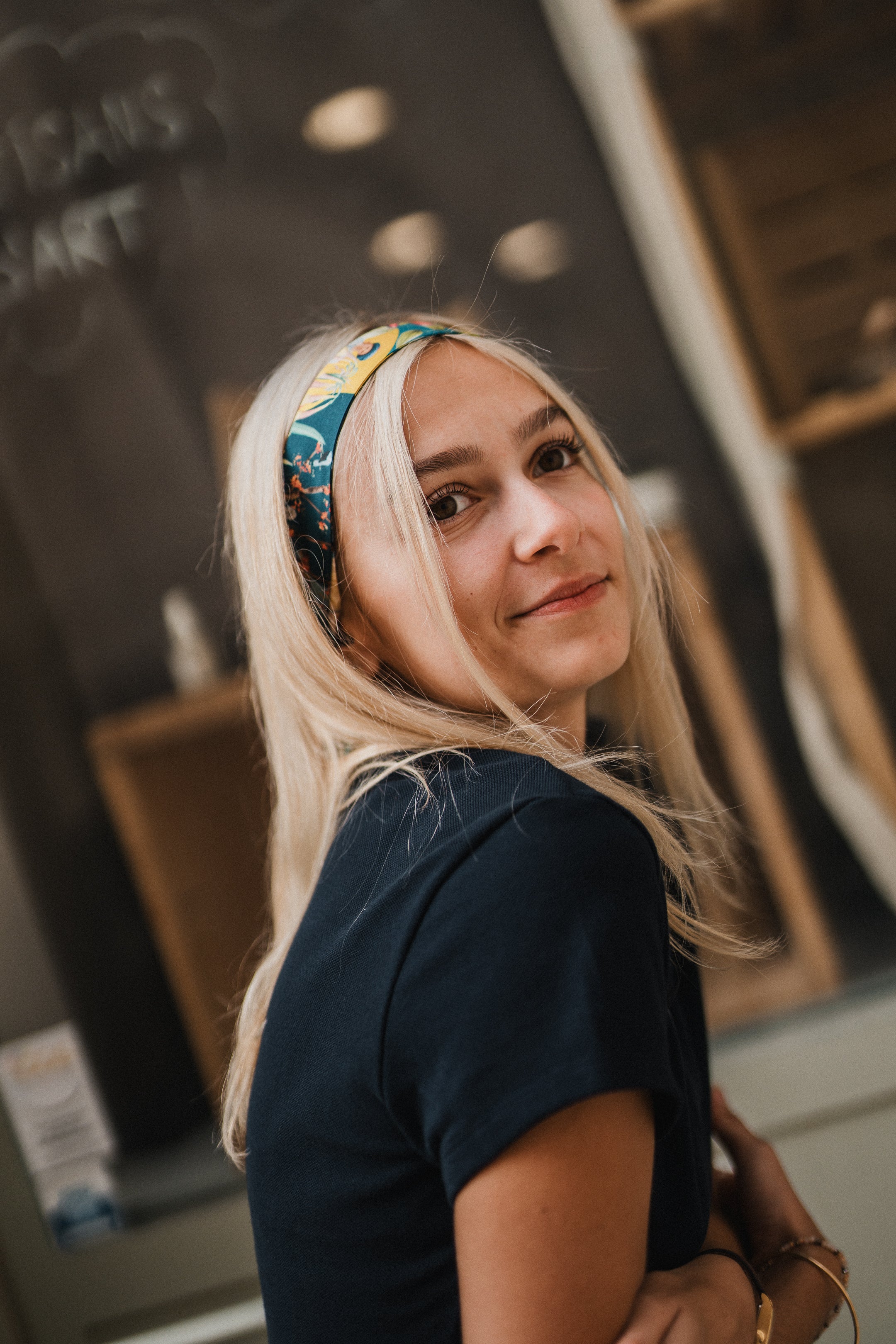 Le Twilly à nouer est un petit foulard en soie tout en longueur qui se met soit au poignet, autour du cou ou dans les cheveux.