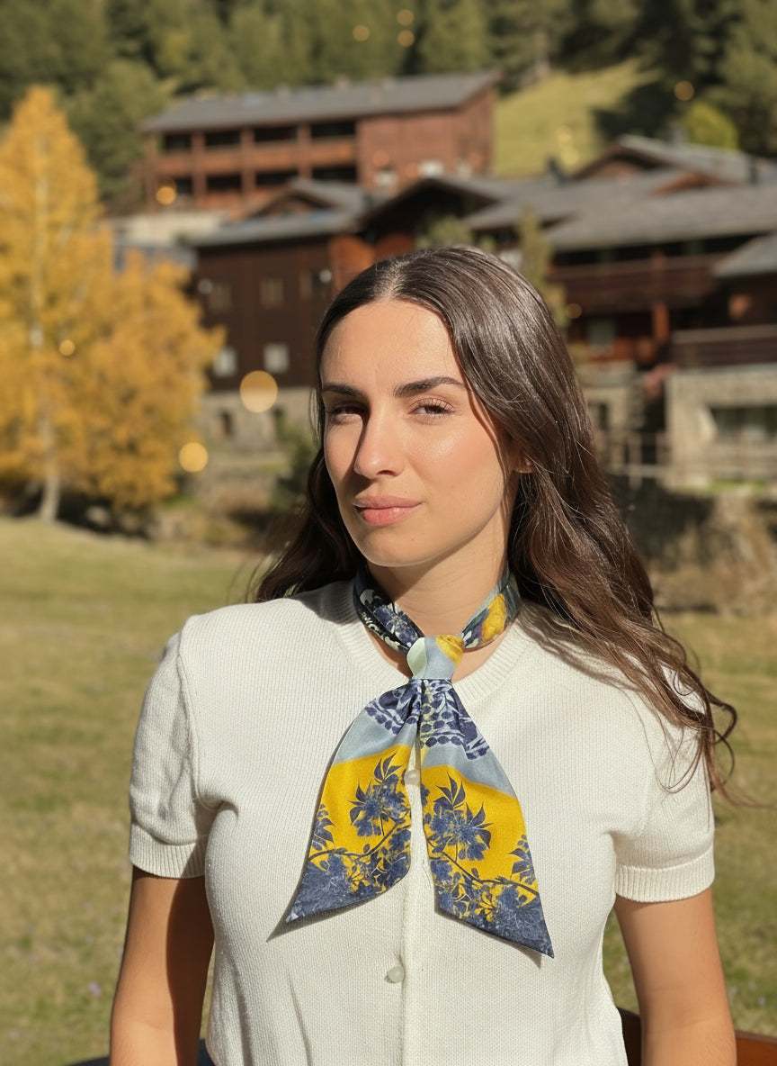 Le motif de ce twilly évoque un coucher de soleil exotique, alliant les teintes bleu-gris et un jaune vif.