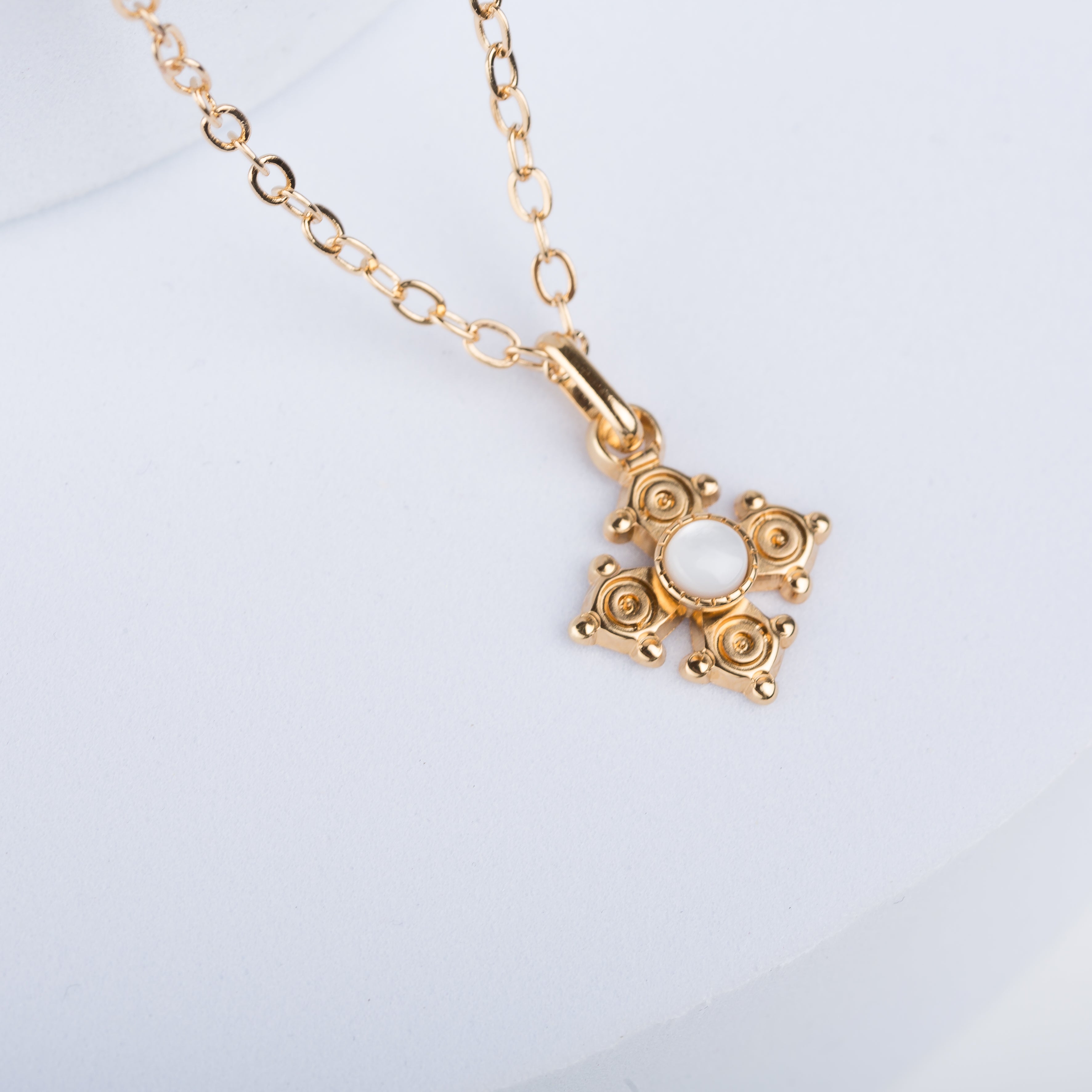 Ce pendentif, qui reprend la forme traditionnelle de la croix de Savoie, est en nacre et Or plaqué 18k.