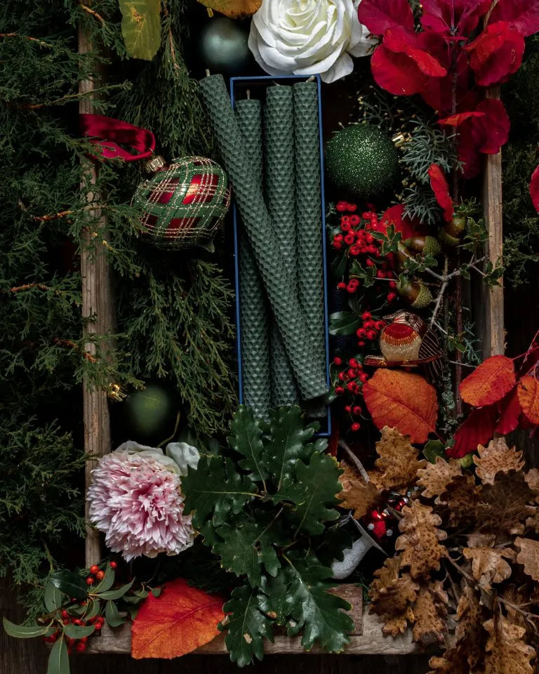 La cire d’abeille est teintée avec des pigments naturels. Composée d’une feuille de cire gaufrée, utilisée traditionnellement dans les ruches, nous la roulons avec soin autour d’une mèche en coton biologique.