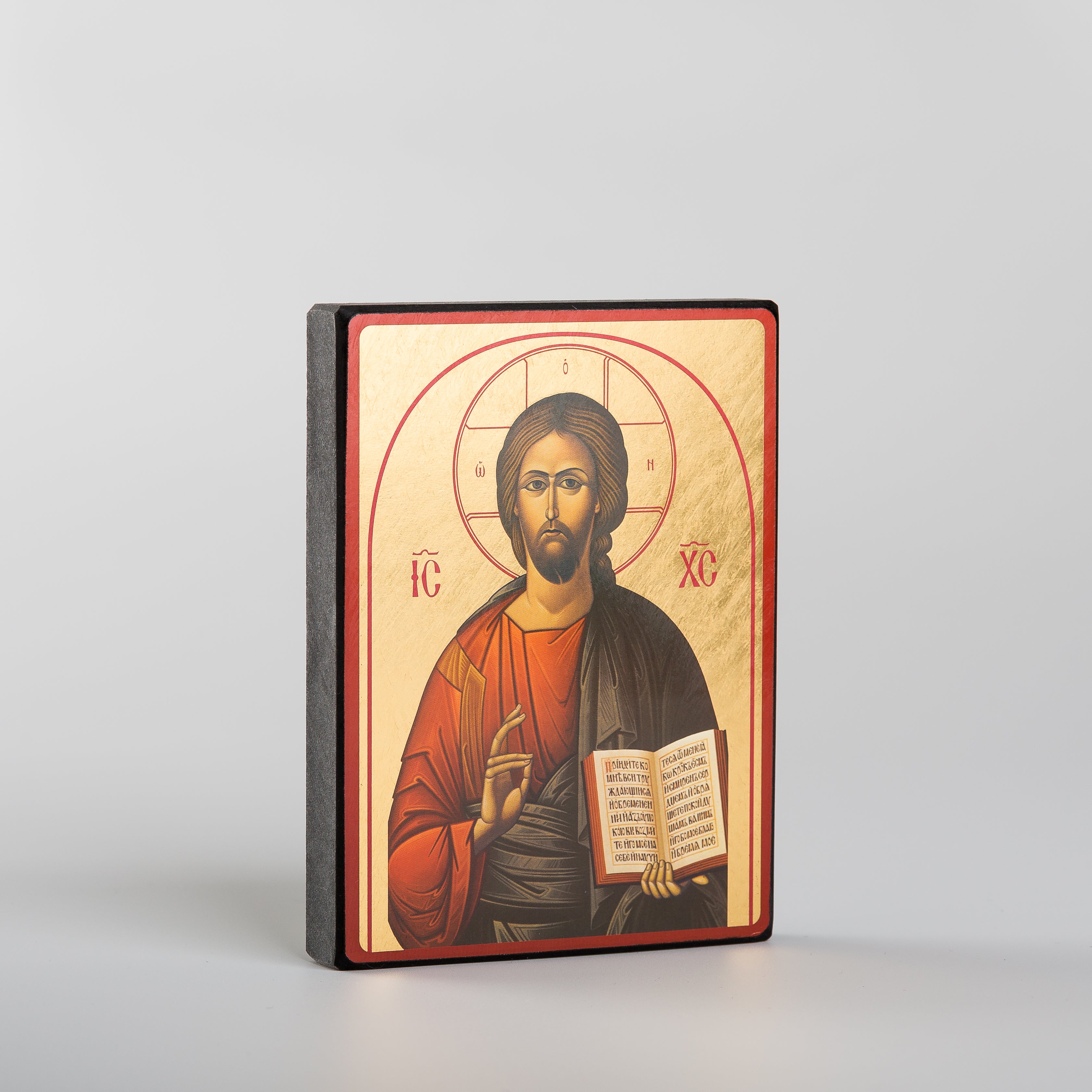 Cette icône reflète une symbolique traditionnelle : la tunique pourpre signifie la divinité du Christ et le manteau bleu en évoque sa nature humaine. A l'intérieur de l'auréole les trois lettres inscrites dans la croix sont des lettres grecques qui signifient: "Celui qui est". La forme arrondie concentre l'attention sur la présence du Christ.