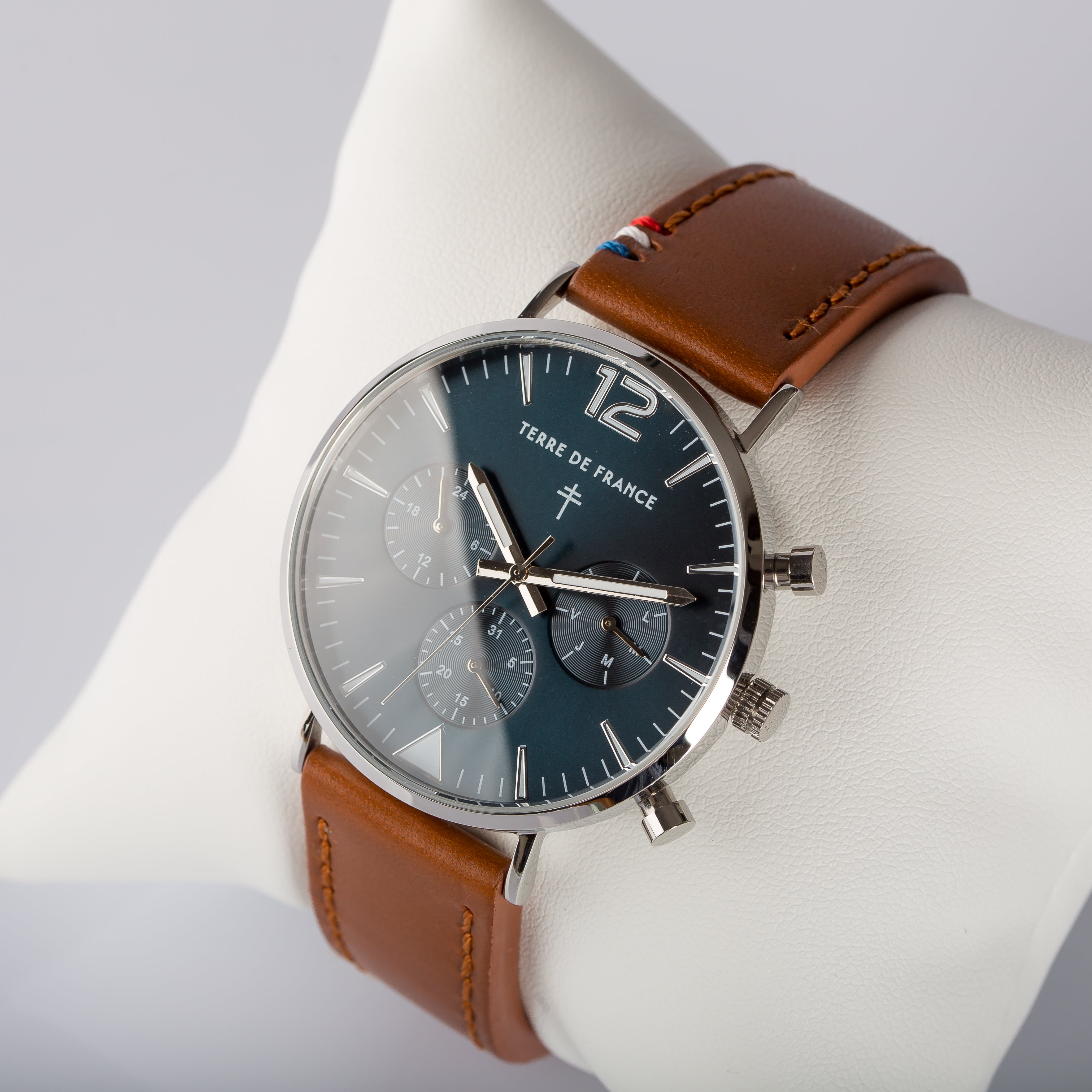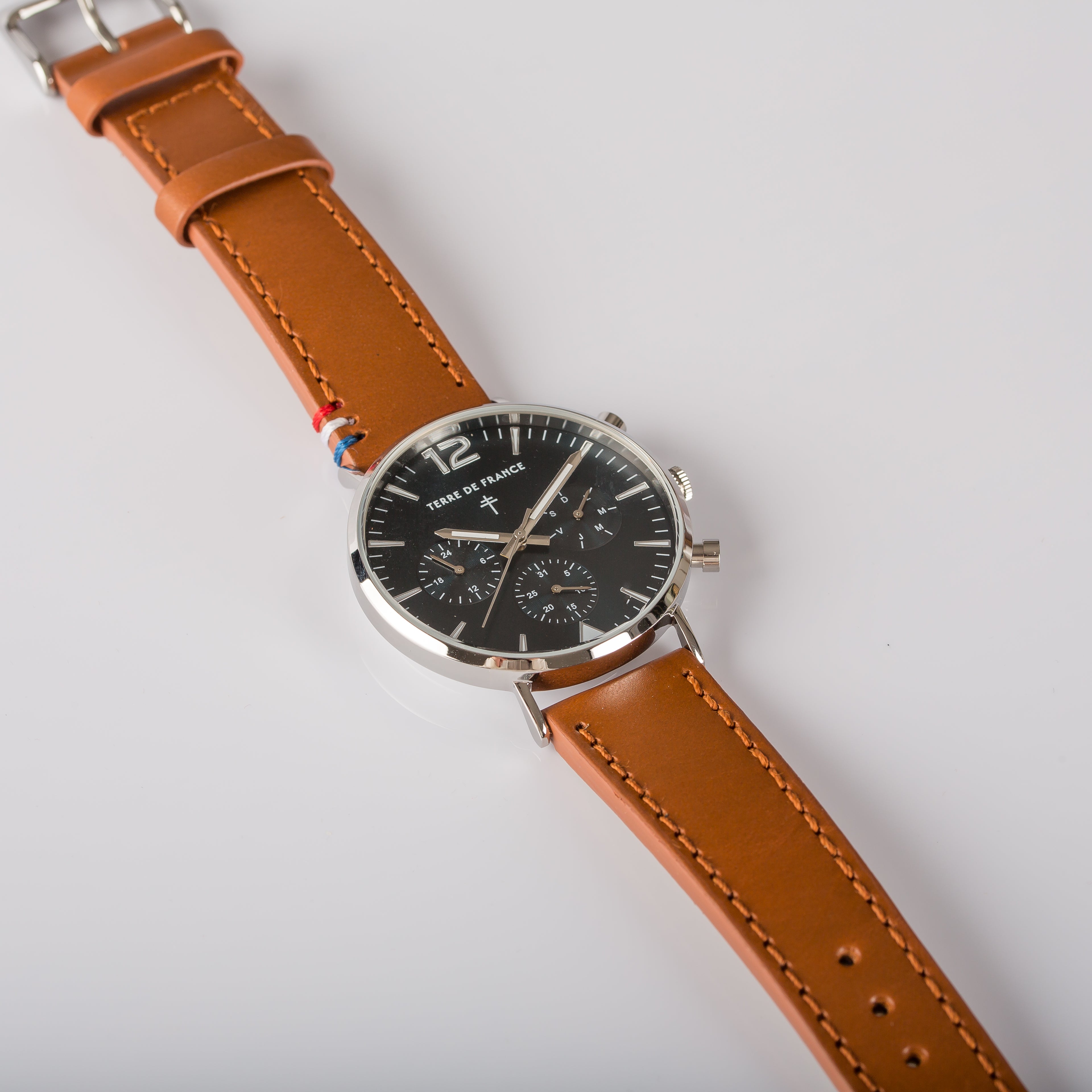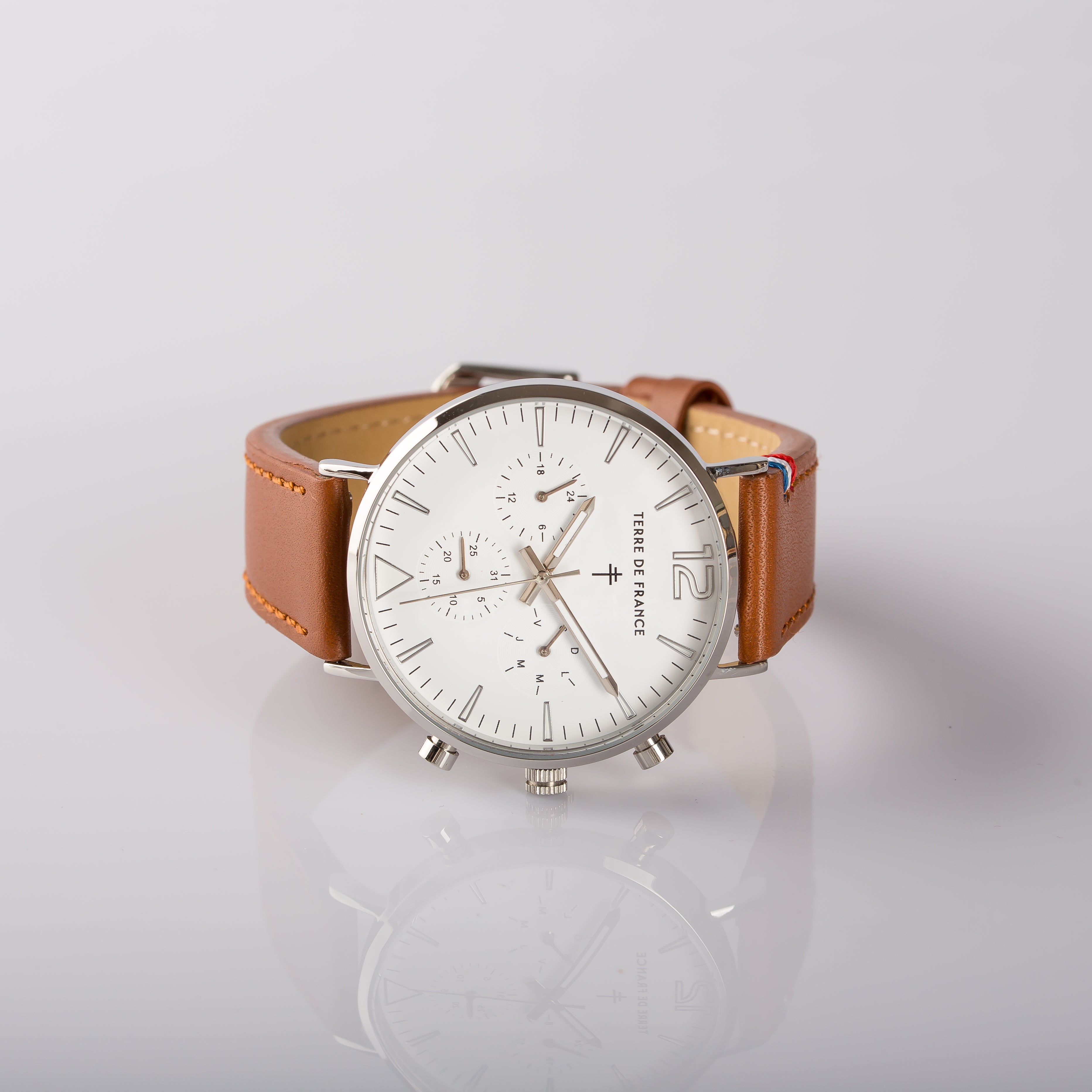 Boitier acier finition chromée 41mm. Verre minéral bombé et bracelet en cuir Milano.